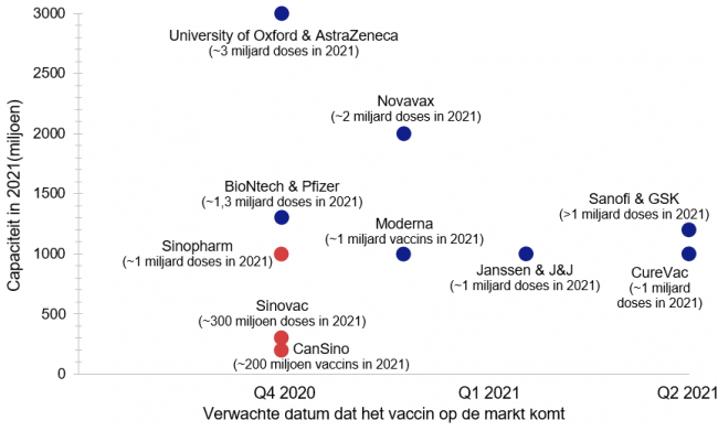 Verwachte datum waarop de meest veelbelovende vaccins op de markt komen en de productiecapaciteit in 2021. Vaccins in het rood zijn tot op heden niet aangekocht door de Europese Commissie. Data afkomstig van press releases van producenten en JPMorgan. Laatste update: 13 november. (Vaccins waarvan we verwachten dat ze niet op de Nederlandse markt zullen verschijnen zijn rood) De figuur berust op eerdere opgaves van vaccinproducenten. Nu de goedkeuring van enkele vaccins dichterbij komt is een preciezer beeld van de vaccinvoorraden noodzakelijk, mede voor het maken van van plannen voor de toediening van de vaccins. bron: www.knvm.nl