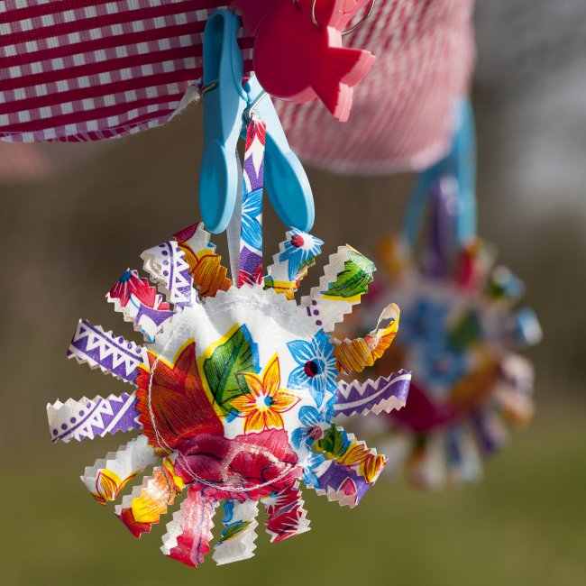 Knip met de kartelschaar van het tafelzeil twee cirkels van 8 cm Ø en 16 strookjes van 1 x 8 cm. Knip met een gewone schaar een lange strook van 1 x 20 cm. Steek de langste strook door de veer van de wasknijper. Naai de strook met wasknijper aan de achterkant van een cirkel. Maak lussen van de kleine strookjes en naai ze vast aan de achterkant van de cirkel. Speld de tweede cirkel erop. Naai het vast, maar laat een stukje open om de hanger te vullen. Doe de steen in de hanger en naai het dicht. Gebruik hiervoor het ritssluitingvoetje op de naaimachine. Geen naaimachine? Gebruik naald en stevig garen. Naai eerst de langste strook vast. Plak de lussen vast met plakband, leg de tweede cirkel erop en naai alles in één keer vast.