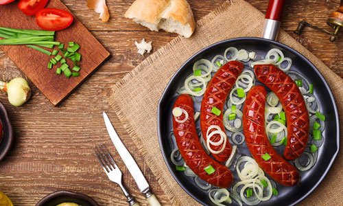 Verwijder het vel en snij de worst in dunne plakjes. Klop een marinade van de bouillon, mosterd, azijn, olie, wat zout en versgemalen peper. Schenk de marinade over de worst en meng voorzichtig, totdat alle plakjes omhuld zijn met de marinade. Laat 1 uur intrekken. Pel de ui, snij in dunne plakjes en haal de ringen met de vingers los. Strooi ze met de bieslook over de worst. Garneer met blaadjes kropsla of little gem. Voeg naar smaak nog wat zout of peper toe. Lekker met pretzels, bij een glas Duits bier.