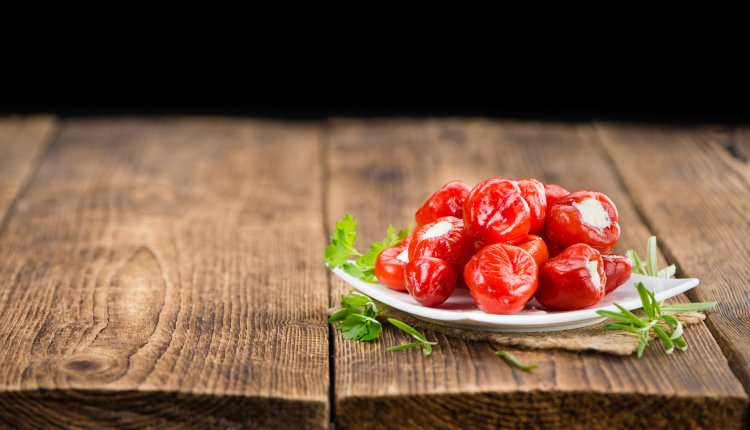- Doe de massa over in een spuitzak en spuit mooie rozetten in de uitgeholde paprika’s.