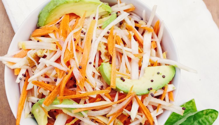 8. Meng de appel en wortel door de rammenas. Geef het vlees en de aardappelen erbij.