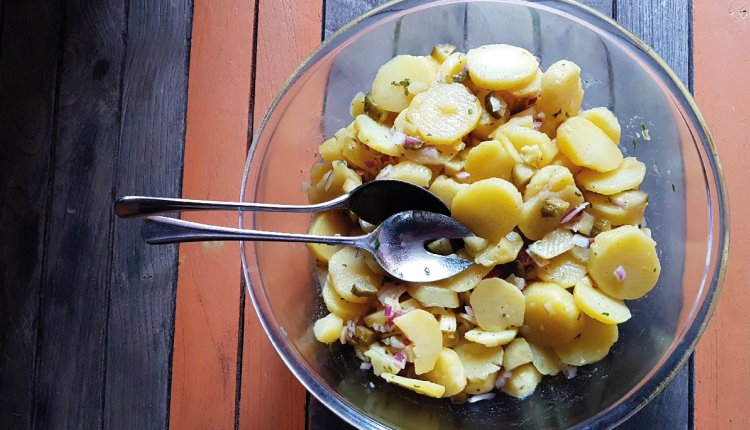 - Meng de dressing door de nog warme krieltjes en laat dit afkoelen.