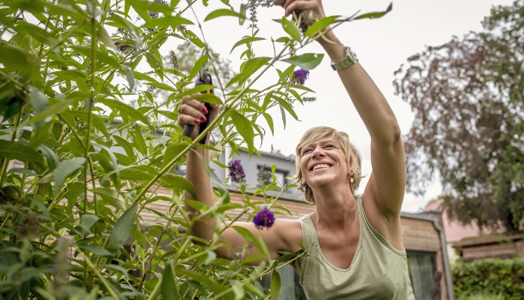 - Knip voor een eindeloze nazomerbloei de uitgebloeide bloemen van vlinderstruiken steeds weg.