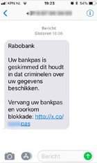 Er gaat een sms rond van 'Rabobank' waarin staat de bankpas van de ontvanger 'geskimd' is. Maar let op, deze sms is niet afkomstig van Rabobank!