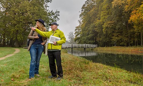 Op de parkeerplaats van Landgoed Beerschoten in De Bilt zie ik in de verte iemand in een gifgroen jasje ongeduldig heen en weer wandelen. Dat moet onze gids Henk van Limpt zijn. Mensen vertellen over cultuur en natuur is al zeventien jaar zijn lust en zijn leven. Volgens Henk had ik eigenlijk met zijn vrouw Corry moeten wandelen. “Doordat zij het mij gunt, kan ik zoveel vrijwilligerswerk doen”, verklaart hij vol liefde. Binnenkort vieren ze hun vijftigjarig huwelijk, en daar is hij trots op. Net als op zijn dochters, kleinkinderen en vooruit, ook op zijn werk als vrijwilliger. De hoeveelheid activiteiten is niet op één hand te tellen, dat mag ik best weten. “Ik val graag op en ik vind het geweldig leuk om te doen.”
