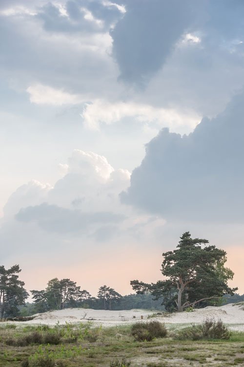 Zwijgend steken we de Lange Duinen over, zoals ze hier heten. Het is een uitzonderlijk zachte winterdag. De lage zon maakt lange schaduwen achter ons in het zand. Vanwege de koude groeide hier 10.000 jaar geleden weinig en door sterke westenwinden ontstond dit levend stuifzandgebied. Nog steeds heeft de wind hier vrij spel, maar dan geholpen door mensenhanden. Die voorkomen dat de grote open stukken dichtgroeien met bomen. Hier en daar op de Lange Duinen vind je nog een jeneverbesstruik of een imposante vliegden.