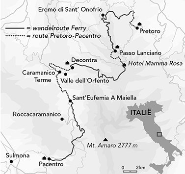 De volgende dagen trek ik dwars over de bergrug via de Passo Lanciano naar het gehucht Decontra bij de Orfento-kloof. Op de lagere hellingen voert het pad door dichte eiken- en beukenbossen, hogerop door struikgewas, jeneverbes, brem en meidoorn. Alpenkraaien dartelen rond de toppen; soms zitten ze achter een buizerd aan als die te dichtbij komt. Af en toe kom ik een vervallen ronde stenen hut tegen, waar herders vroeger konden schuilen voor noodweer.