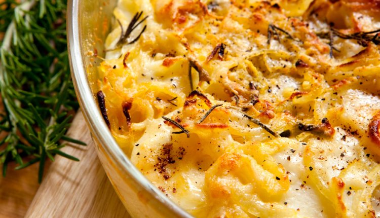 - Schep de aardappelpuree in een ovenvaste schaal en bedek bodem en de wanden hiermee.