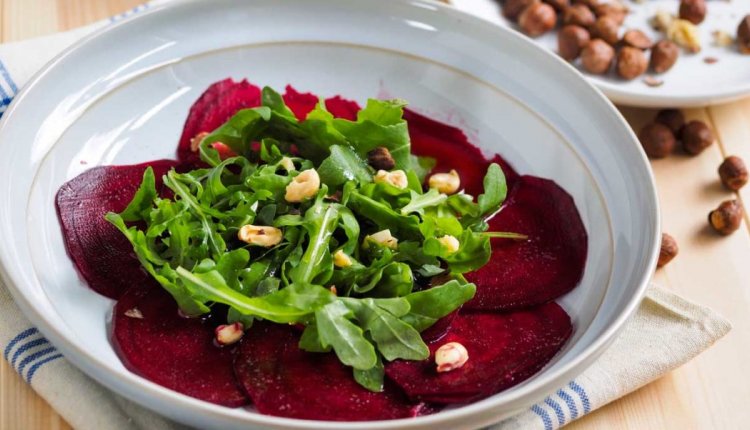 Carpaccio is traditioneel van rundvlees gemaakt. Inmiddels kijken we echter niet meer op van zalmcarpaccio, carpaccio van zucchini of inktviscarpaccio op ons bord. Ook lekker: carpaccio van bietjes. Vooral deze variant, met hazelnoten en rucola.