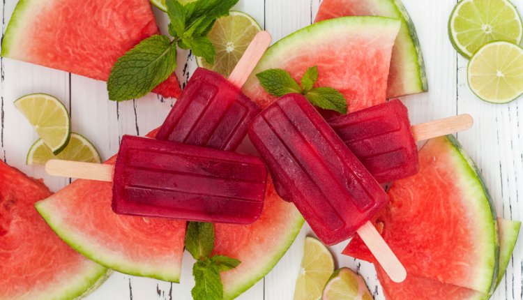 Lekker op warme dagen, deze zelfgemaakte watermeloen-ijsjes met limoen en munt.