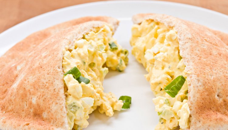 - Snijd de pitabroodjes open en beleg ze met de ijsbergsla. Schep de eiersalade erin.