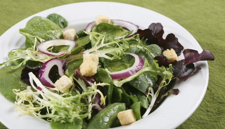 - Doe de spinazie en de doperwtjes in een slaschaal en schenk het sausje er over.