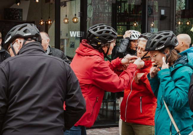 Aan de testrit doen ook geoefende e-bikers mee: Henny, die helemaal uit Zeeuws-Vlaanderen is gekomen, en Leon uit Sittard. Henny is geïnteresseerd in techniek en is benieuwd naar vermogen en actieradius van de nieuwste modellen. Leon wilde het verschil weten tussen riem en ketting en stelt vast, dat er niet zoveel verschil is. “Mijn vrouw en ik hebben een e-bike met riemaandrijving en dat is heel geschikt voor de stad. Een derailleur zou dan voor langere tochten zijn, maar het rijgevoel is hetzelfde. Wat ook mooi is, dat je steeds meer laadpunten ziet. Vooral hier, bij de terrasjes. Kun je mooi even een biertje drinken en heb je er weer een paar streepjes bij op je display.” Zowel Henny als Leon pakken ook nog graag de mountainbike. “Als ik daar te oud voor word is een e-mountainbike de volgende stap”, lacht Henny. “Sowieso stap ik nooit zonder helm op de fiets. Ik vind het onverstandig dat we dat in Nederland nog zo weinig doen.” Leon vindt elektrisch fietsen wel een beetje verslavend. “Ik fiets graag off-road om mijn conditie op peil te houden. Maar als je een tijdje op je e-bike hebt getoerd is het wel weer even pittig, fietsen zonder ondersteuning.”